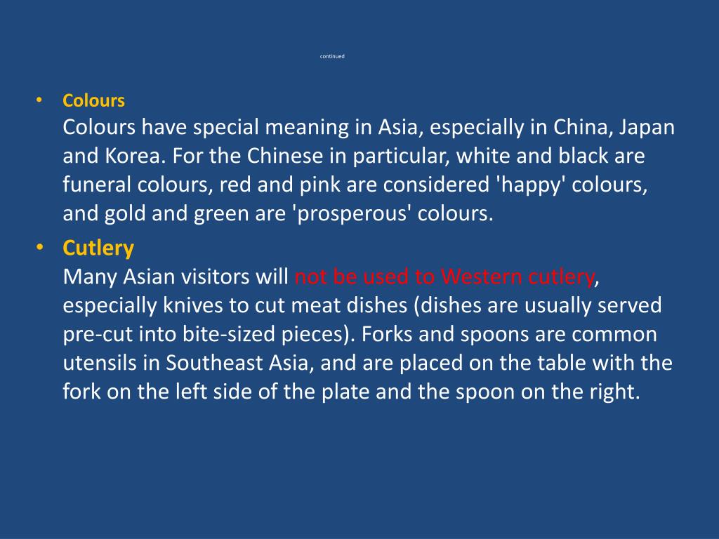 continued ColoursColours have special meaning in Asia, especially in China, Japan and Korea. For the Chinese in particular, white and black are funeral colours, red and pink are considered 'happy' colours, and gold and green are 'prosperous' colours. CutleryMany Asian visitors will not be used to Western cutlery, especially knives to cut meat dishes (dishes are usually served pre-cut into bite-sized pieces). Forks and spoons are common utensils in Southeast Asia, and are placed on the table with the fork on the left side of the plate and the spoon on the right.