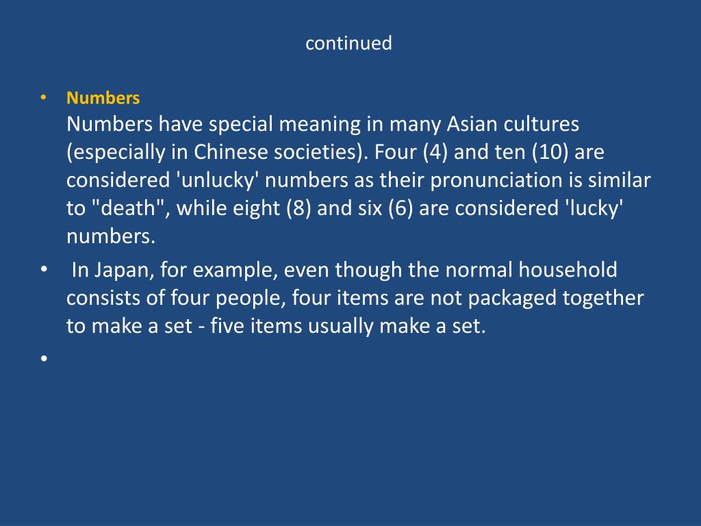 continued NumbersNumbers have special meaning in many Asian cultures (especially in Chinese societies). Four (4) and ten (10) are considered 'unlucky' numbers as their pronunciation is similar to "death", while eight (8) and six (6) are considered 'lucky' numbers. In Japan, for example, even though the normal household consists of four people, four items are not packaged together to make a set - five items usually make a set.
