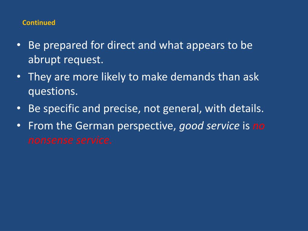 Continued Be prepared for direct and what appears to be abrupt request. They are more likely to make demands than ask questions. Be specific and precise, not general, with details. From the German perspective, goodservice is no nonsense service.