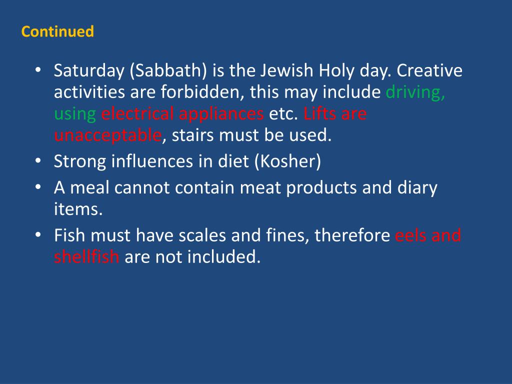 Continued Saturday (Sabbath) is the Jewish Holy day. Creative activities are forbidden, this may include driving, using electrical appliances etc. Lifts are unacceptable, stairs must be used. Strong influences in diet (Kosher) A meal cannot contain meat products and diary items. Fish must have scales and fines, therefore eels and shellfish are not included.