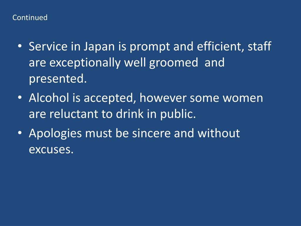 Continued Service in Japan is prompt and efficient, staff are exceptionally well groomed and presented. Alcohol is accepted, however some women are reluctant to drink in public. Apologies must be sincere and without excuses.