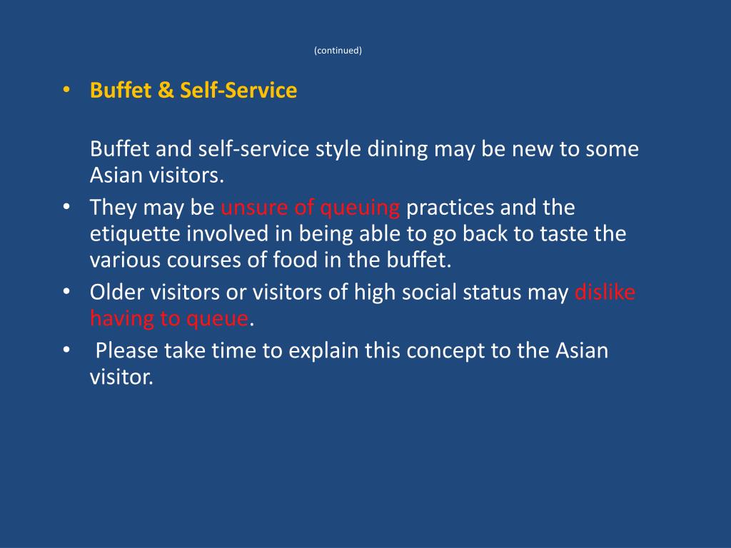 (continued) Buffet & Self-Service Buffet and self-service style dining may be new to some Asian visitors. They may be unsure of queuing practices and the etiquette involved in being able to go back to taste the various courses of food in the buffet. Older visitors or visitors of high social status may dislike having to queue. Please take time to explain this concept to the Asian visitor.