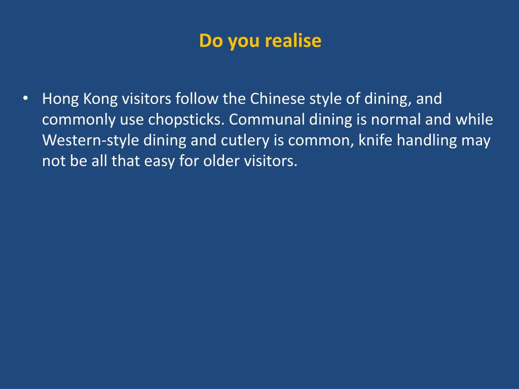 Do you realise Hong Kong visitors follow the Chinese style of dining, and commonly use chopsticks. Communal dining is normal and while Western-style dining and cutlery is common, knife handling may not be all that easy for older visitors.