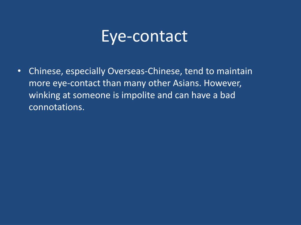 Eye-contact • Chinese, especially Overseas-Chinese, tend to maintain more eye-contact than many other Asians. However, winking at someone is impolite and can have a bad connotations.