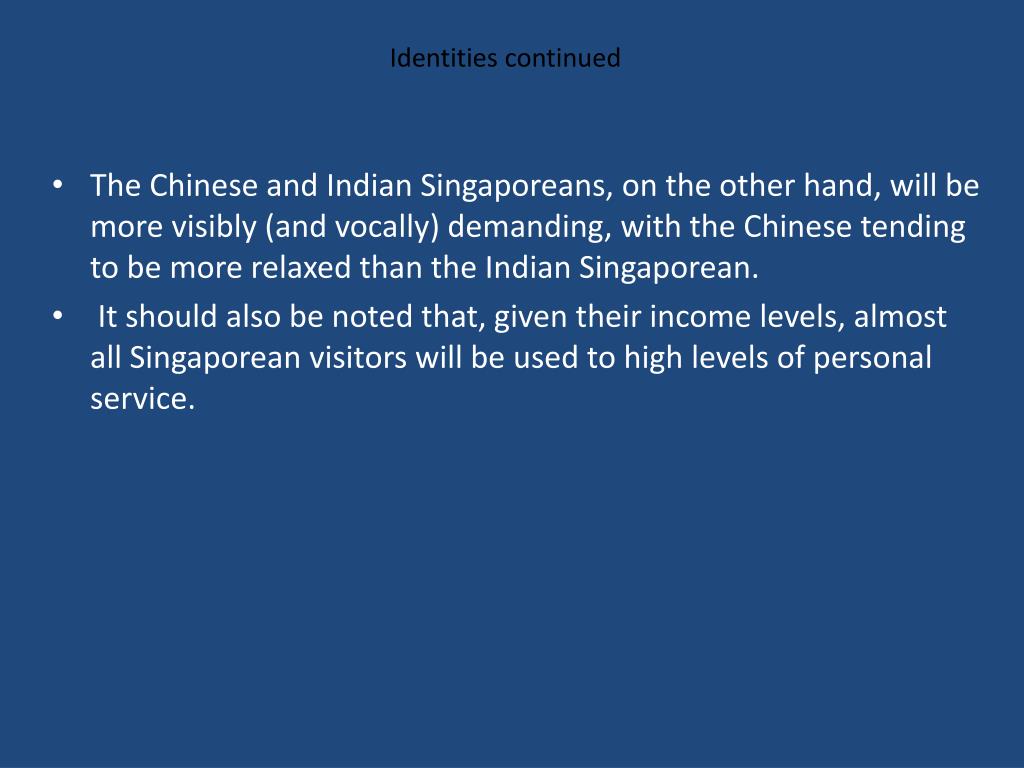 Identities continued The Chinese and Indian Singaporeans, on the other hand, will be more visibly (and vocally) demanding, with the Chinese tending to be more relaxed than the Indian Singaporean. It should also be noted that, given their income levels, almost all Singaporean visitors will be used to high levels of personal service.