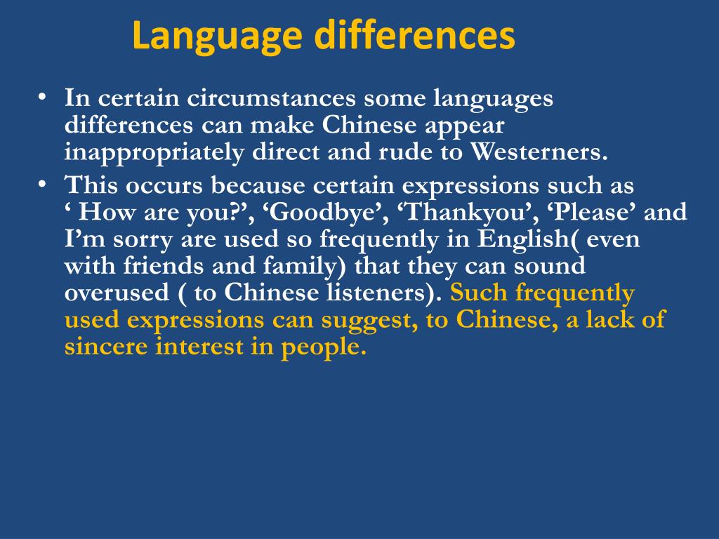 Language differences In certain circumstances some languages differences can make Chinese appear inappropriately direct and rude to Westerners. This occurs because certain expressions such as ‘ How are you?’, ‘Goodbye’, ‘Thankyou’, ‘Please’ and I’m sorry are used so frequently in English( even with friends and family) that they can sound overused ( to Chinese listeners). Such frequently used expressions can suggest, to Chinese, a lack of sincere interest in people.