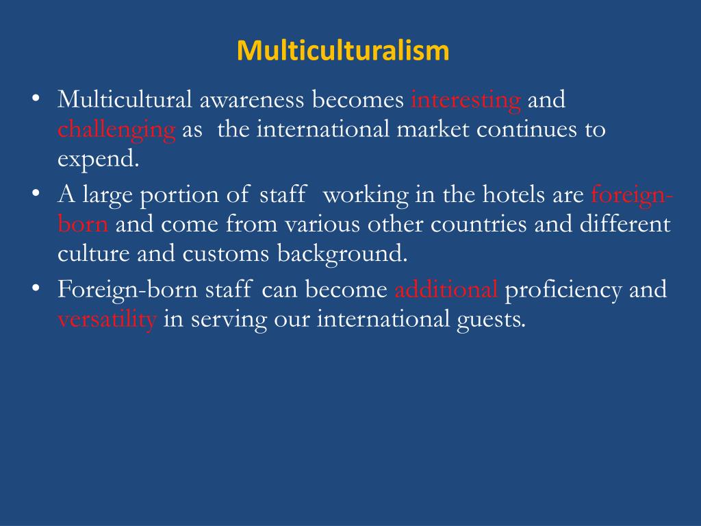 Multiculturalism Multicultural awareness becomes interesting and challenging as the international market continues to expend. A large portion of staff working in the hotels are foreign-born and come from various other countries and different culture and customs background. Foreign-born staff can become additional proficiency and versatility in serving our international guests.
