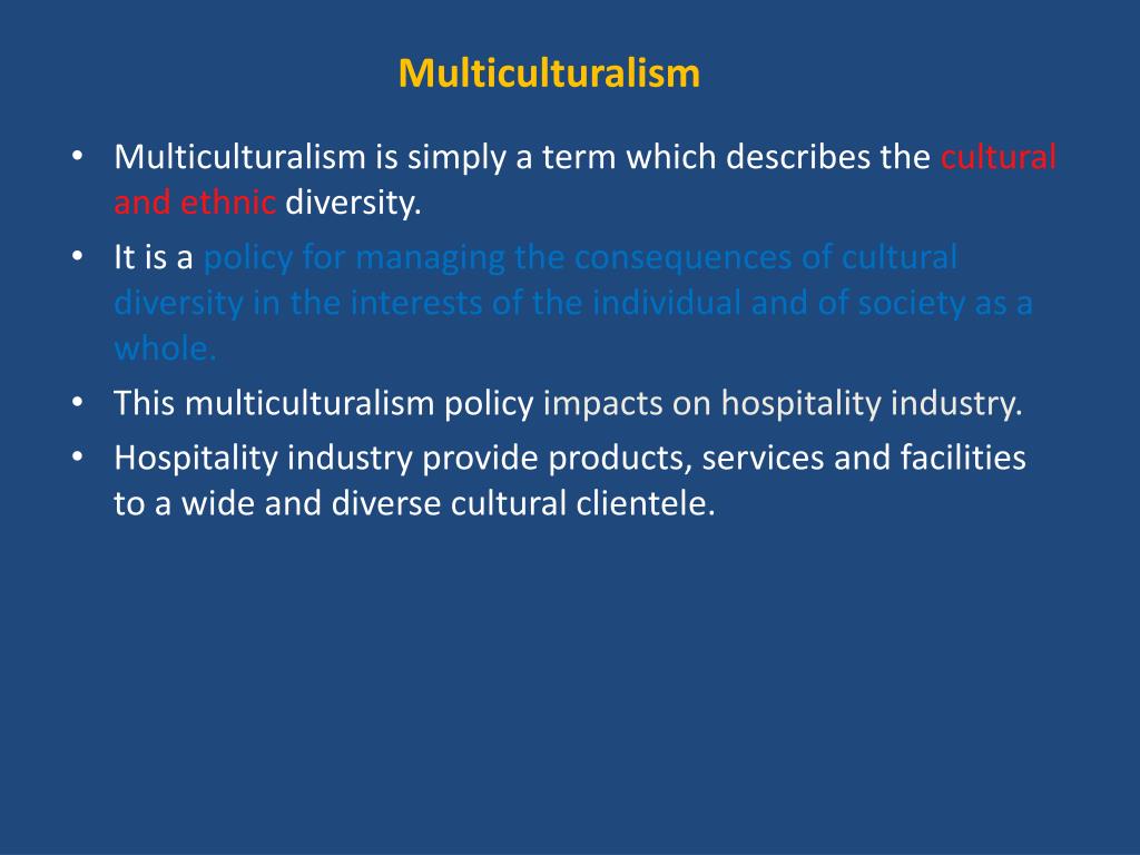 Multiculturalism Multiculturalism is simply a term which describes the cultural and ethnic diversity. It is a policy for managing the consequences of cultural diversity in the interests of the individual and of society as a whole. This multiculturalism policy impacts on hospitality industry. Hospitality industry provide products, services and facilities to a wide and diverse cultural clientele.