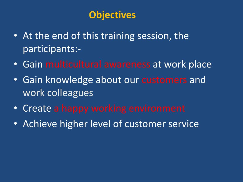 Objectives At the end of this training session, the participants:- Gain multicultural awareness at work place Gain knowledge about our customersand work colleagues Create a happy working environment Achieve higher level of customer service