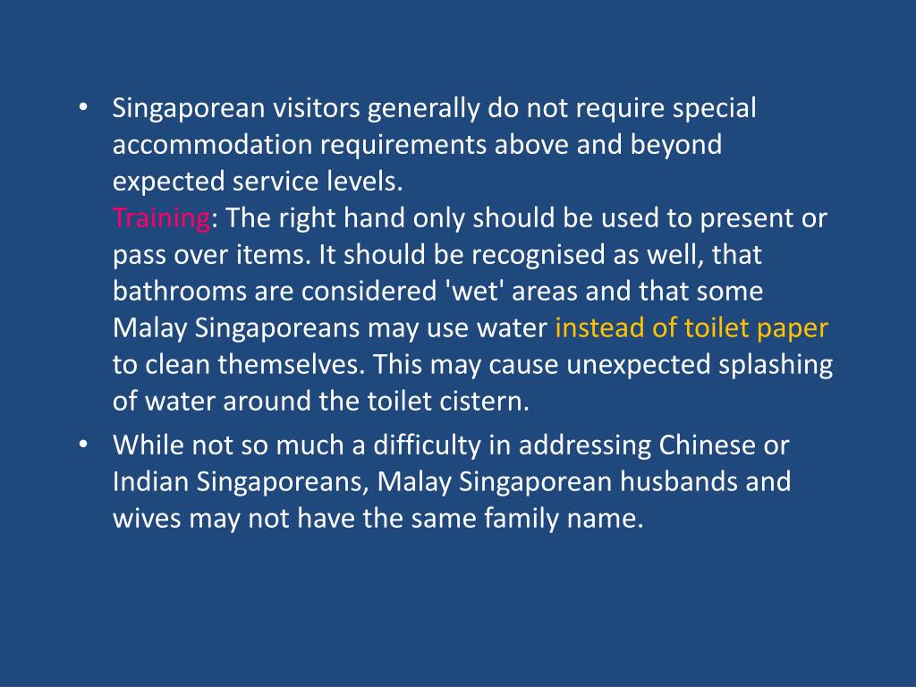 Singaporean visitors generally do not require special accommodation requirements above and beyond expected service levels. Training: The right hand only should be used to present or pass over items. It should be recognised as well, that bathrooms are considered 'wet' areas and that some Malay Singaporeans may use water instead of toilet paper to clean themselves. This may cause unexpected splashing of water around the toilet cistern. While not so much a difficulty in addressing Chinese or Indian Singaporeans, Malay Singaporean husbands and wives may not have the same family name.