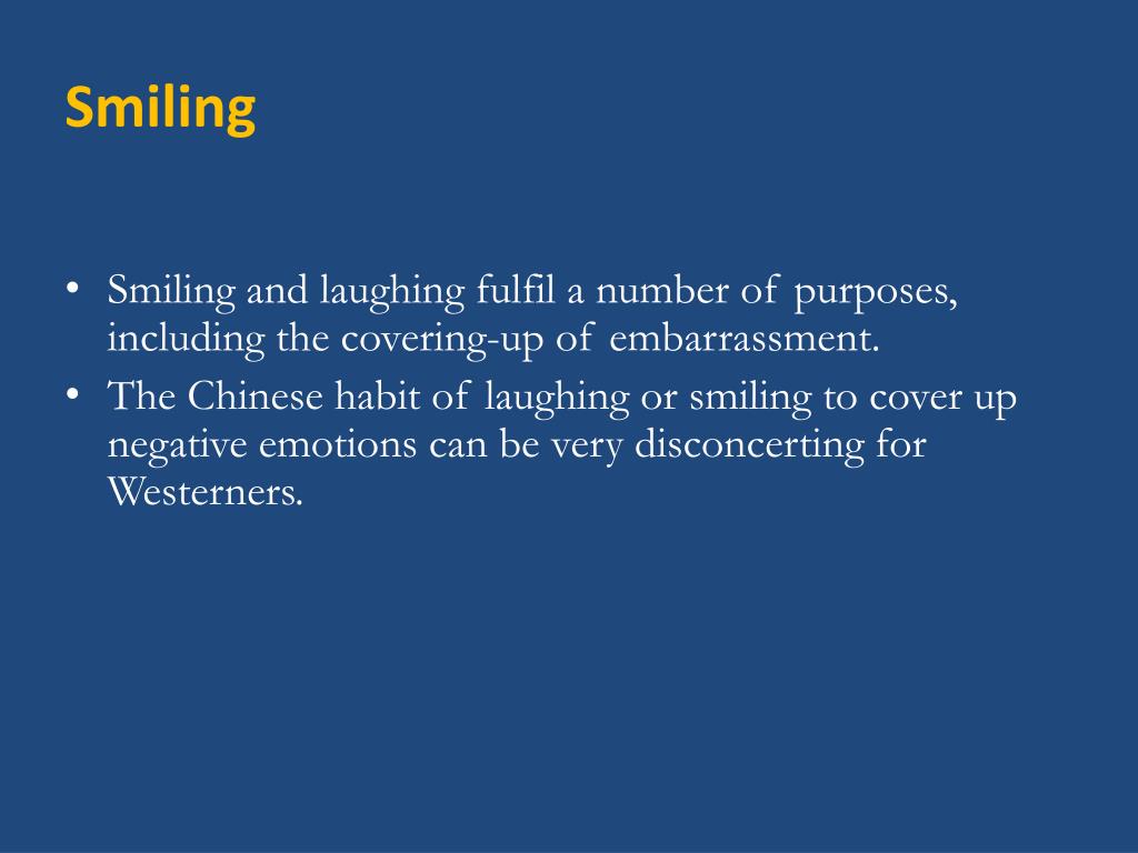 Smiling • Smiling and laughing fulfil a number of purposes, including the covering-up of embarrassment. • The Chinese habit of laughing or smiling to cover up negative emotions can be very disconcerting for Westerners.