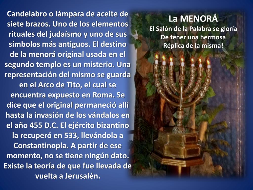 Candelabro o lámpara de aceite de siete brazos. Uno de los elementos rituales del judaísmo y uno de sus símbolos más antiguos. El destino de la menorá original usada en el segundo templo es un misterio. Una representación del mismo se guarda en el Arco de Tito, el cual se encuentra expuesto en Roma. Se dice que el original permaneció allí hasta la invasión de los vándalos en el año 455 D.C. El ejército bizantino la recuperó en 533, llevándola a Constantinopla. A partir de ese momento, no se tiene ningún dato. Existe la teoría de que fue llevada de vuelta a Jerusalén. La MENORÁ El Salón de la Palabra se gloría De tener una hermosa Réplica de la misma!
