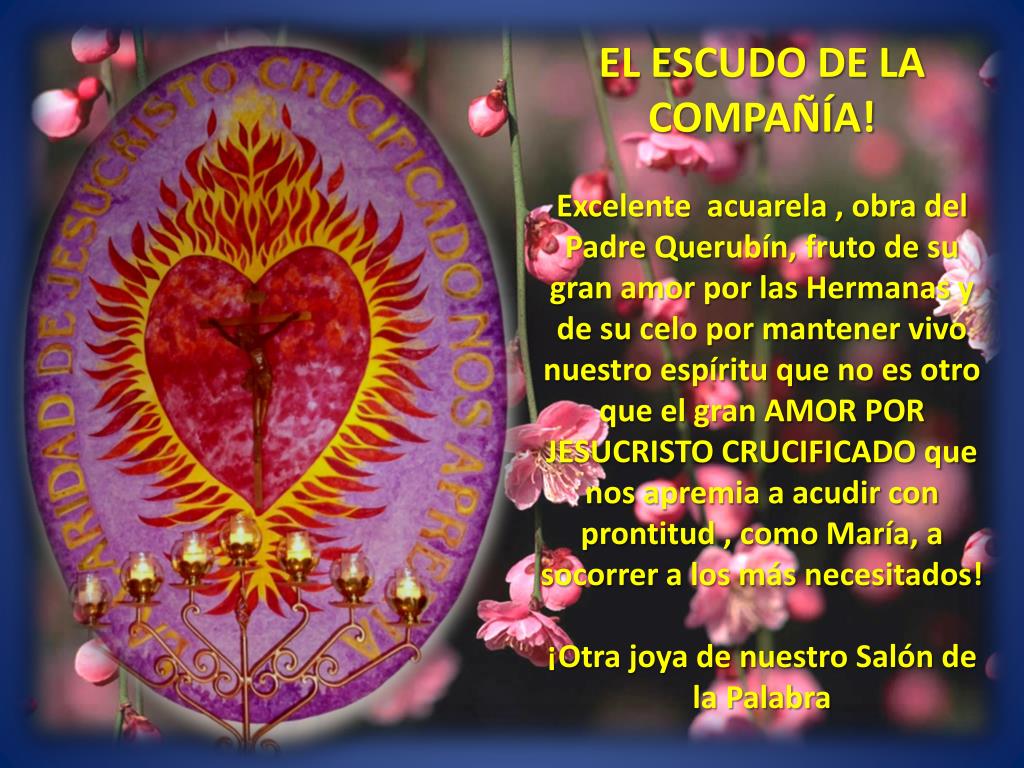 EL ESCUDO DE LA COMPAÑÍA! Excelente acuarela , obra del Padre Querubín, fruto de su gran amor por las Hermanas y de su celo por mantener vivo nuestro espíritu que no es otro que el gran AMOR POR JESUCRISTO CRUCIFICADO que nos apremia a acudir con prontitud , como María, a socorrer a los más necesitados! ¡Otra joya de nuestro Salón de la Palabra