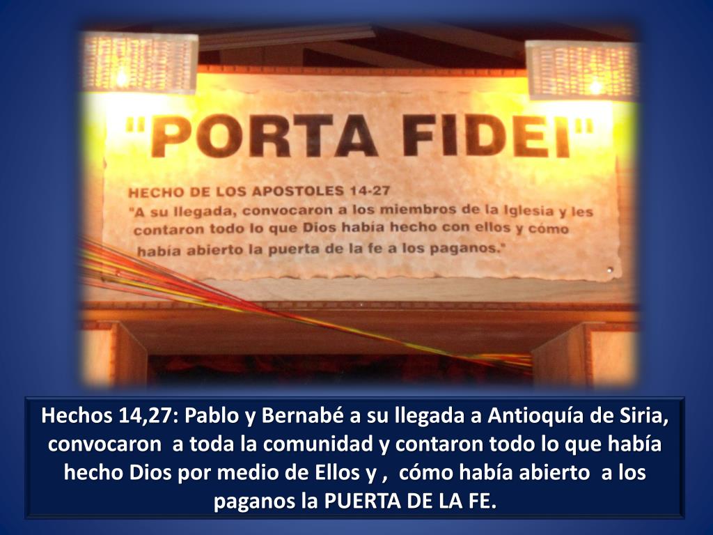 Hechos 14,27: Pablo y Bernabé a su llegada a Antioquía de Siria, convocaron a toda la comunidad y contaron todo lo que había hecho Dios por medio de Ellos y , cómo había abierto a los paganos la PUERTA DE LA FE.