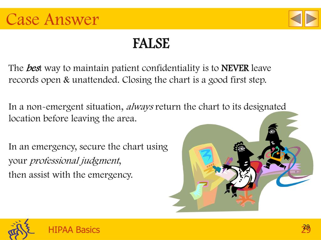 Case Answer FALSE The best way to maintain patient confidentiality is to NEVER leave records open & unattended. Closing the chart is a good first step. In a non-emergent situation, always return the chart to its designated location before leaving the area. In an emergency, secure the chart using your professional judgment, then assist with the emergency.