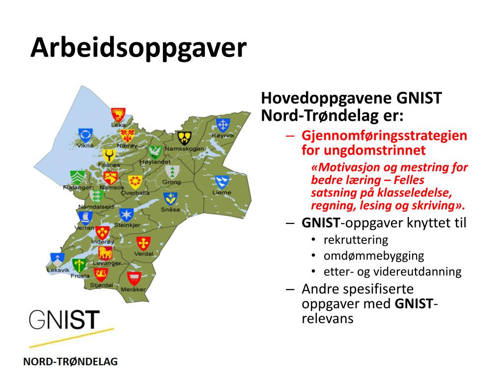 Arbeidsoppgaver Hovedoppgavene GNIST Nord-Trøndelag er: • Gjennomføringsstrategien for ungdomstrinnet «Motivasjon og mestring for bedre læring – Felles satsning på klasseledelse, regning, lesing og skriving». • GNIST-oppgaver knyttet til • rekruttering • omdømmebygging • etter- og videreutdanning • Andre spesifiserte oppgaver med GNIST-relevans