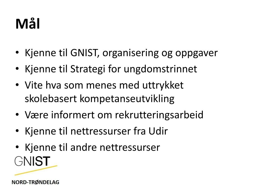 Mål • Kjenne til GNIST, organisering og oppgaver • Kjenne til Strategi for ungdomstrinnet • Vite hva som menes med uttrykket skolebasert kompetanseutvikling • Være informert om rekrutteringsarbeid • Kjenne til nettressurser fra Udir • Kjenne til andre nettressurser
