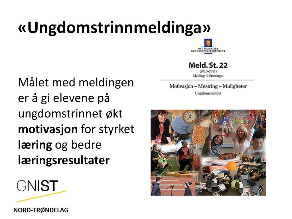 «Ungdomstrinnmeldinga» Målet med meldingen er å gi elevene på ungdomstrinnet økt motivasjon for styrket læring og bedre læringsresultater