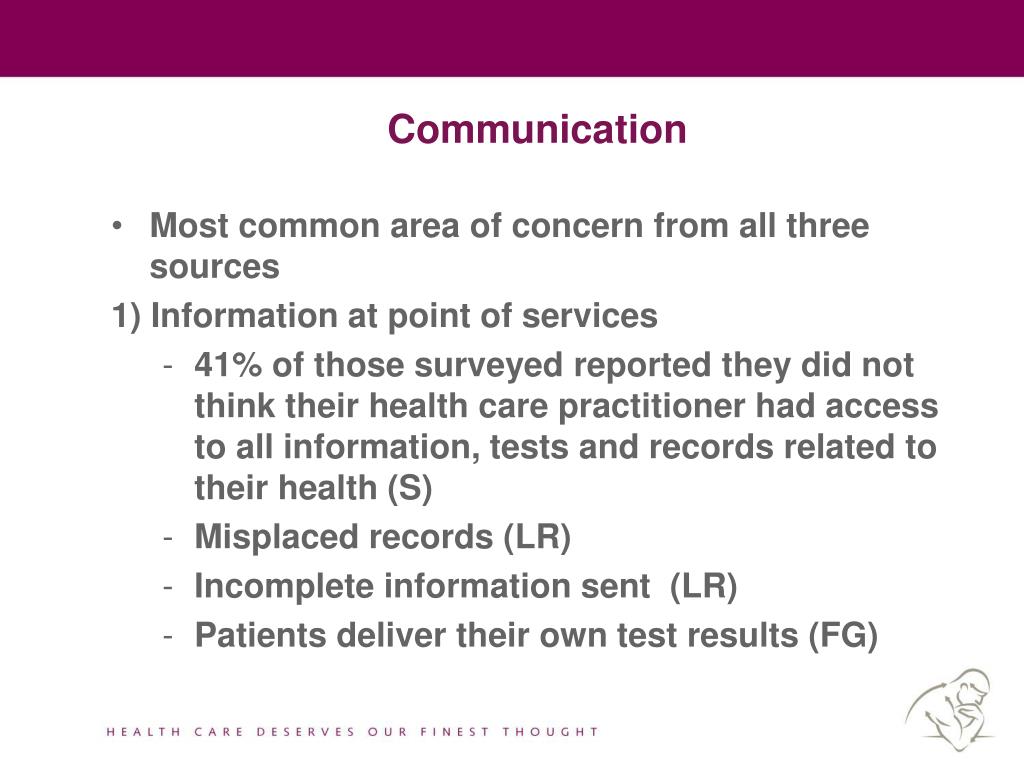 Communication • Most common area of concern from all three sources • 1) Information at point of services • 41% of those surveyed reported they did not think their health care practitioner had access to all information, tests and records related to their health (S) • Misplaced records (LR) • Incomplete information sent (LR) • Patients deliver their own test results (FG)