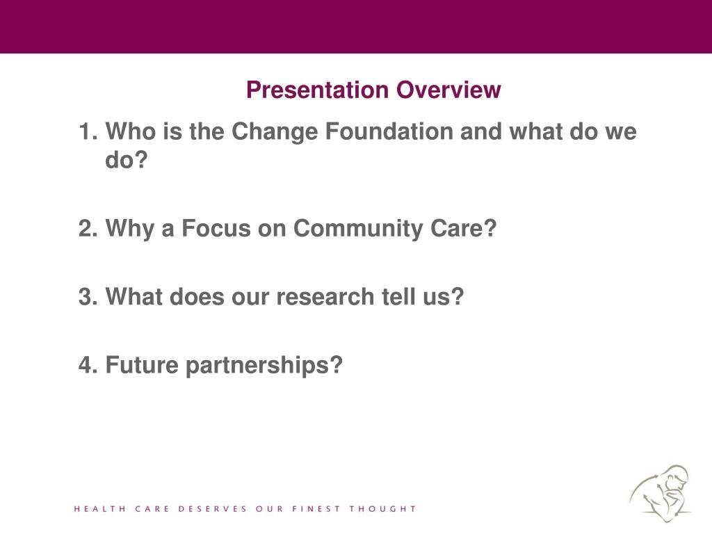 Presentation Overview • Who is the Change Foundation and what do we do? • Why a Focus on Community Care? • What does our research tell us? • Future partnerships?