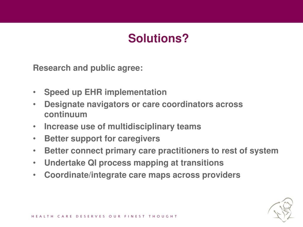 Solutions? • Research and public agree: • Speed up EHR implementation • Designate navigators or care coordinators across continuum • Increase use of multidisciplinary teams • Better support for caregivers • Better connect primary care practitioners to rest of system • Undertake QI process mapping at transitions • Coordinate/integrate care maps across providers