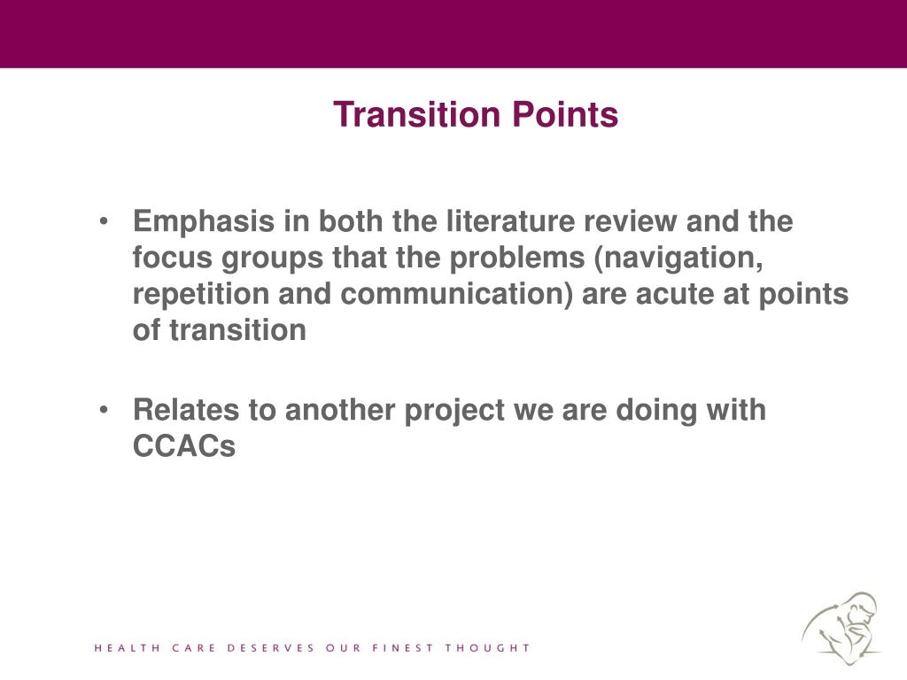 Transition Points • Emphasis in both the literature review and the focus groups that the problems (navigation, repetition and communication) are acute at points of transition • Relates to another project we are doing with CCACs
