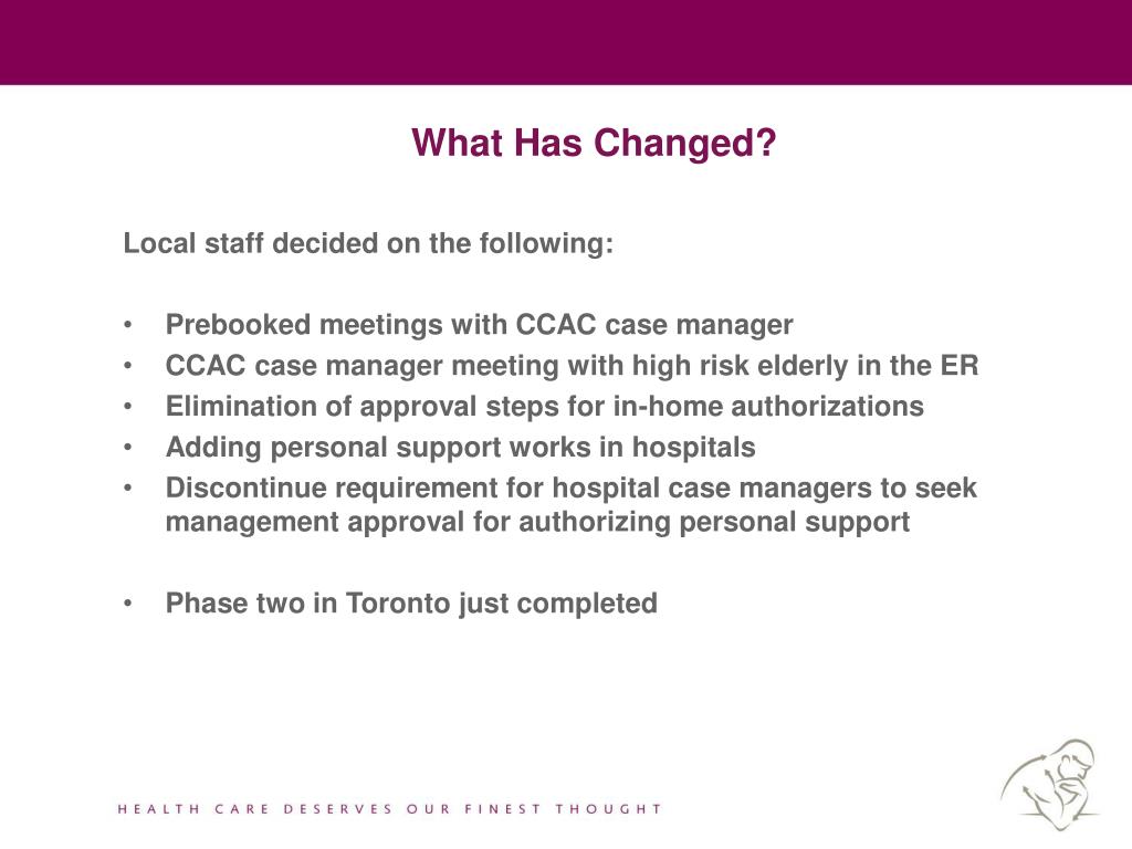 What Has Changed? • Local staff decided on the following: • Prebooked meetings with CCAC case manager • CCAC case manager meeting with high risk elderly in the ER • Elimination of approval steps for in-home authorizations • Adding personal support works in hospitals • Discontinue requirement for hospital case managers to seek management approval for authorizing personal support • Phase two in Toronto just completed
