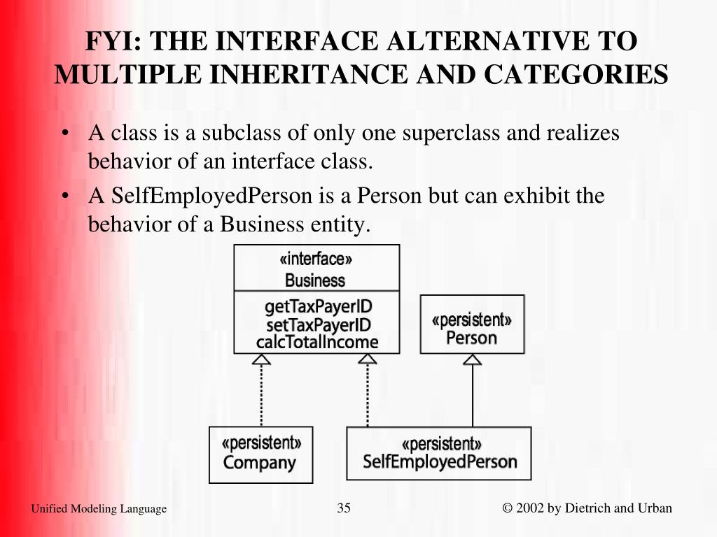 FYI: THE INTERFACE ALTERNATIVE TO MULTIPLE INHERITANCE AND CATEGORIES • A class is a subclass of only one superclass and realizes behavior of an interface class. • A SelfEmployedPerson is a Person but can exhibit the behavior of a Business entity.
