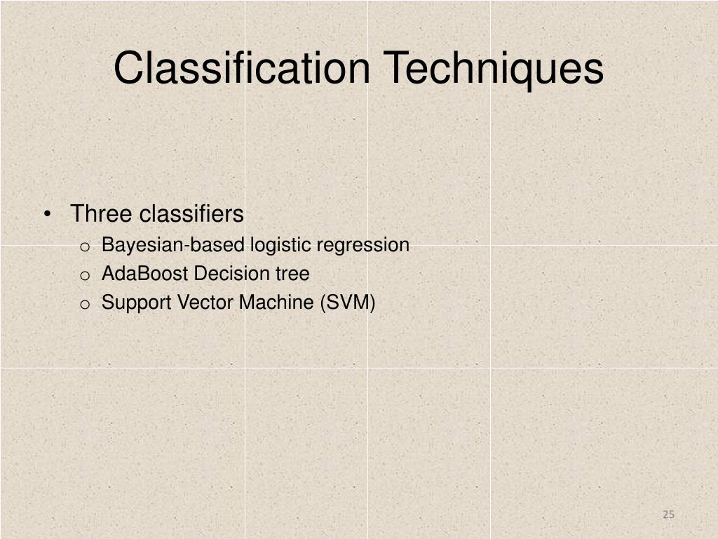 Classification Techniques • Three classifiers • Bayesian-based logistic regression • AdaBoost Decision tree • Support Vector Machine (SVM)