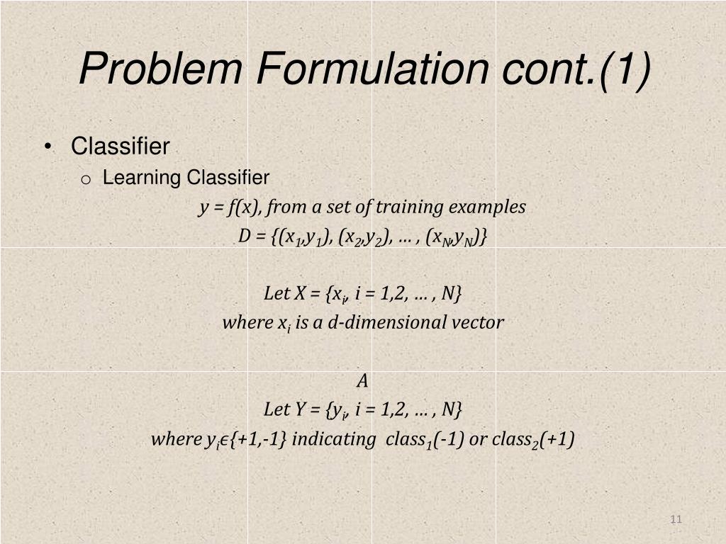 Problem Formulation cont.(1) • Classifier • Learning Classifier y = f(x), from a set of training examples D = {(x1,y1), (x2,y2), … , (xN,yN)} Let X = {xi, i = 1,2, … , N} where xiis a d-dimensional vector A Let Y = {yi, i = 1,2, … , N} where yi{+1,-1} indicating class1(-1) or class2(+1)