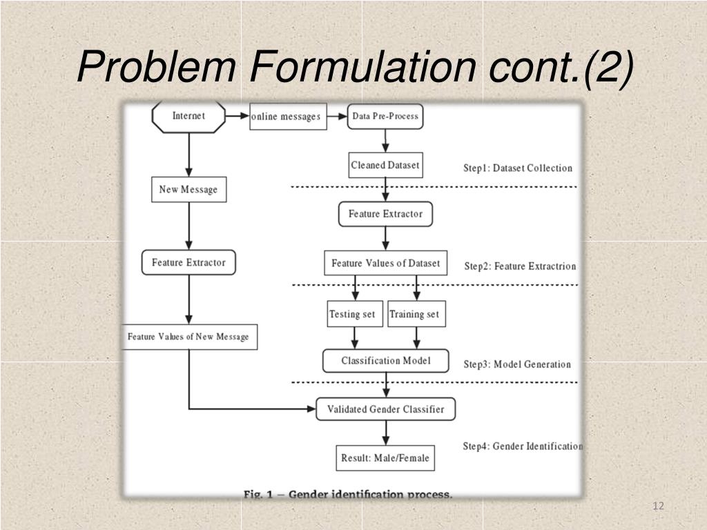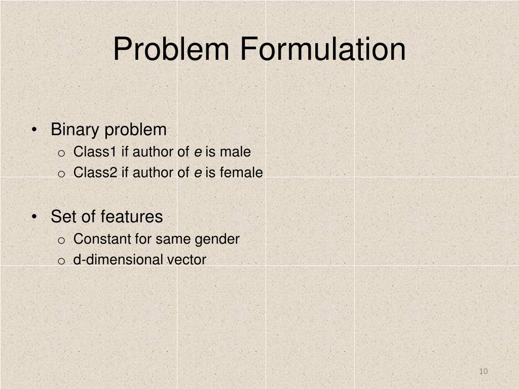Problem Formulation • Binary problem • Class1 if author of e is male • Class2 if author of e is female • Set of features • Constant for same gender • d-dimensional vector