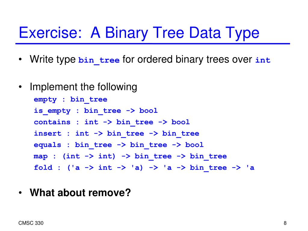 CMSC 330 Exercise: A Binary Tree Data Type Write type bin_tree for ordered binary trees over int Implement the following empty : bin_tree is_empty : bin_tree -> bool contains : int -> bin_tree -> bool insert : int -> bin_tree -> bin_tree equals : bin_tree -> bin_tree -> bool map : (int -> int) -> bin_tree -> bin_tree fold : ('a -> int -> 'a) -> 'a -> bin_tree -> 'a What about remove?