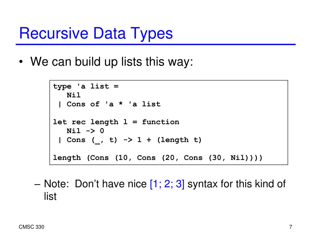 CMSC 330 Recursive Data Types We can build up lists this way: Note: Don’t have nice [1; 2; 3] syntax for this kind of list type 'a list = Nil | Cons of 'a * 'a list let rec length l = function Nil -> 0 | Cons (_, t) -> 1 + (length t) length (Cons (10, Cons (20, Cons (30, Nil))))