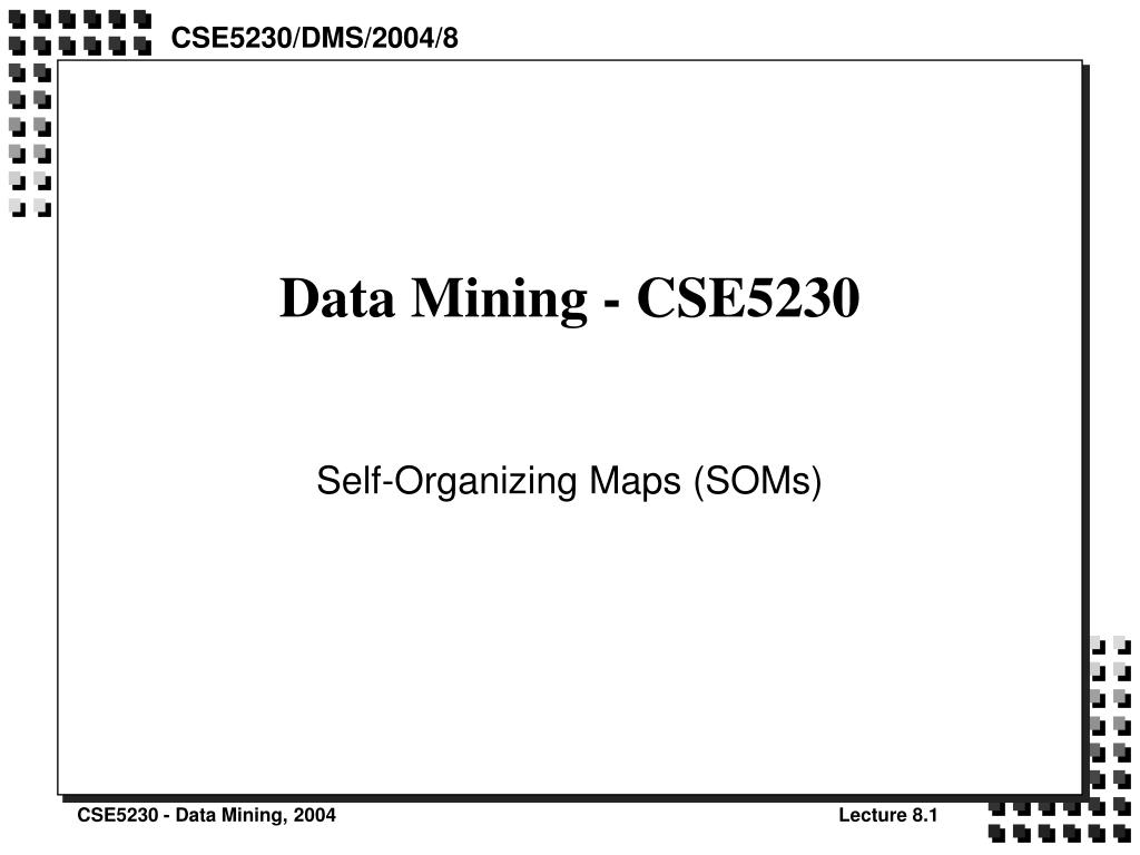 CSE5230/DMS/2004/8. Data Mining - CSE5230. S elf-Organizing Maps (SOMs). Lecture Outline. Motivation unsupervised learning the cortex topographic feature maps biological self-organizing maps Artificial self-organizing maps Kohonen’s self-organizing network learning algorithm examples