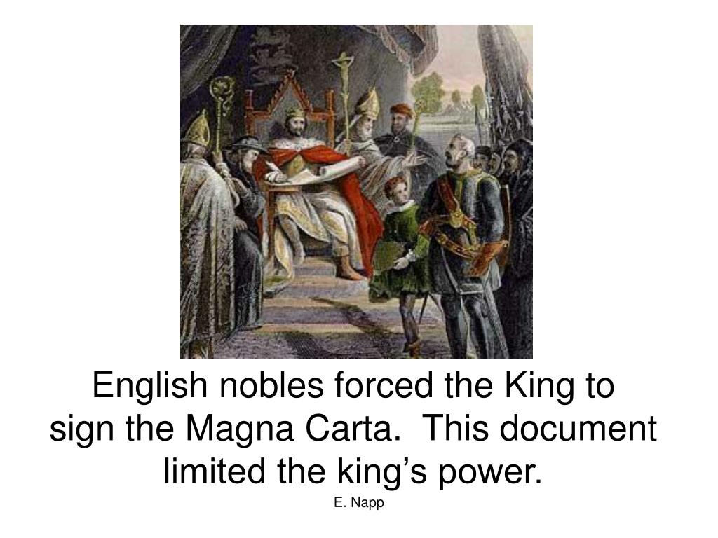 English nobles forced the King to sign the Magna Carta. This document limited the king’s power. E. Napp
