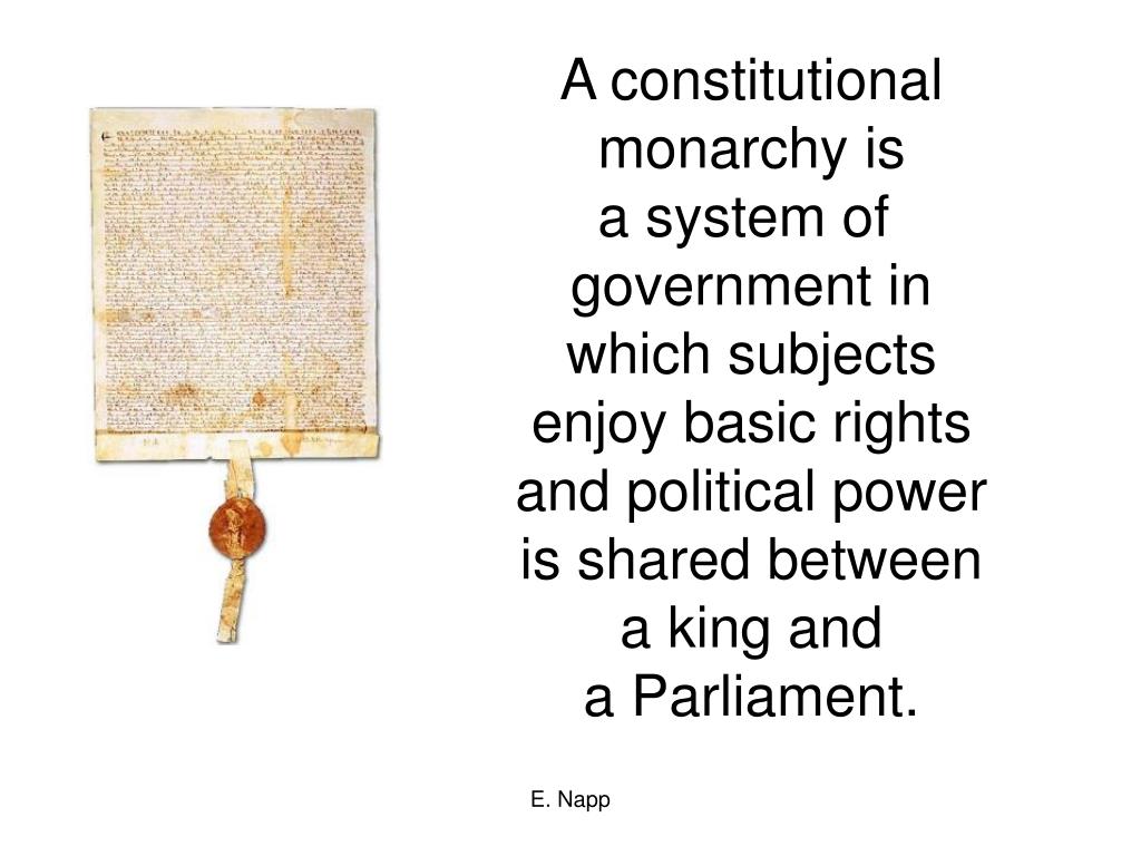A constitutional monarchy is a system of government in which subjects enjoy basic rights and political power is shared between a king and a Parliament. E. Napp