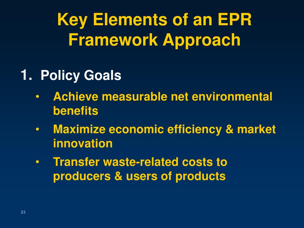 Key Elements of an EPR Framework Approach • Policy Goals • Achieve measurable net environmental benefits • Maximize economic efficiency & market innovation • Transfer waste-related costs to producers & users of products