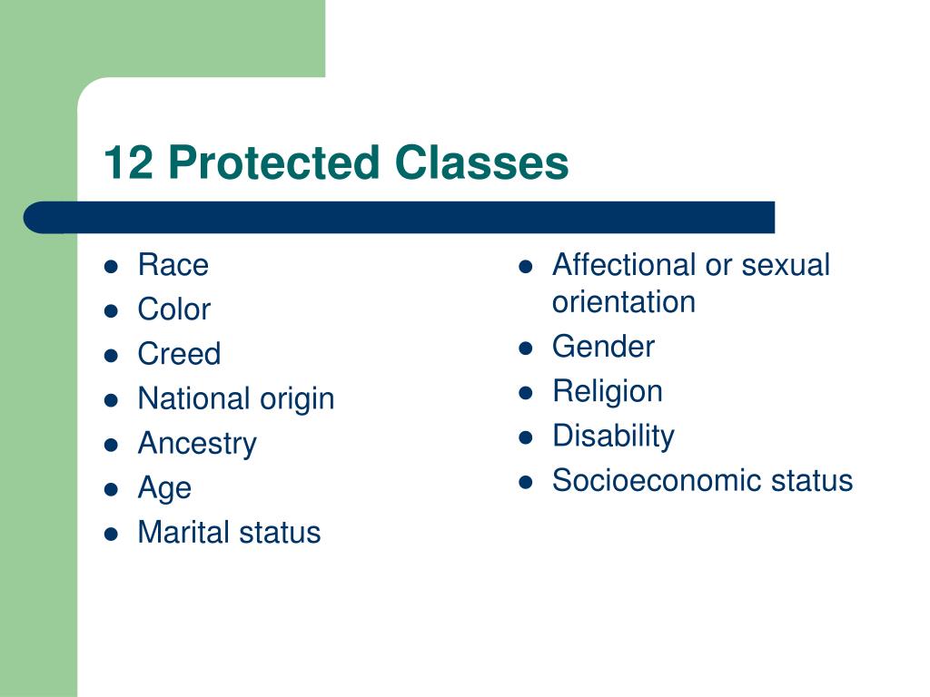 Race Color Creed National origin Ancestry Age Marital status Affectional or sexual orientation Gender Religion Disability Socioeconomic status 12 Protected Classes