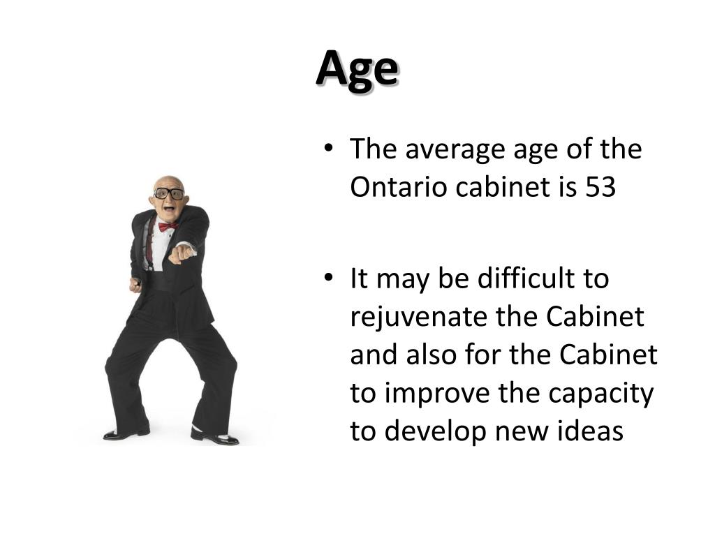 Age • The average age of the Ontario cabinet is 53 • It may be difficult to rejuvenate the Cabinet and also for the Cabinet to improve the capacity to develop new ideas