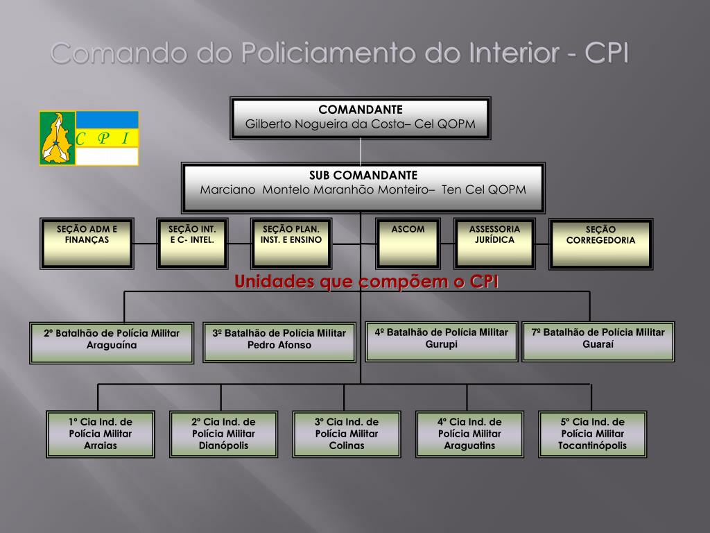 Comando do Policiamento do Interior - CPI COMANDANTE Gilberto Nogueira da Costa– Cel QOPM SUB COMANDANTE Marciano Montelo Maranhão Monteiro– Ten Cel QOPM SEÇÃO ADM E FINANÇAS SEÇÃO INT. E C- INTEL. SEÇÃO PLAN. INST. E ENSINO ASCOM ASSESSORIA JURÍDICA SEÇÃO CORREGEDORIA Unidades que compõem o CPI 4º Batalhão de Polícia Militar Gurupi 7º Batalhão de Polícia Militar Guaraí 2º Batalhão de Polícia Militar Araguaína 3º Batalhão de Polícia Militar Pedro Afonso 1º Cia Ind. de Polícia Militar Arraias 1º Cia Ind. de Policia Militar Arraias 2º Cia Ind. de Polícia Militar Dianópolis 3º Cia Ind. de Polícia Militar Colinas 4º Cia Ind. de Polícia Militar Araguatins 5º Cia Ind. de Polícia Militar Tocantinópolis