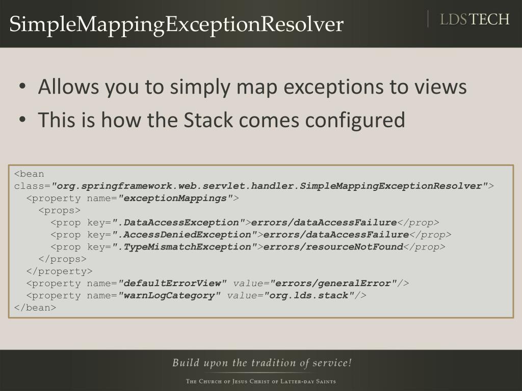 SimpleMappingExceptionResolver • Allows you to simply map exceptions to views • This is how the Stack comes configured <bean class="org.springframework.web.servlet.handler.SimpleMappingExceptionResolver"> <property name="exceptionMappings"> <props> <prop key=".DataAccessException">errors/dataAccessFailure</prop> <prop key=".AccessDeniedException">errors/dataAccessFailure</prop> <prop key=".TypeMismatchException">errors/resourceNotFound</prop> </props> </property> <property name="defaultErrorView" value="errors/generalError"/> <property name="warnLogCategory" value="org.lds.stack"/> </bean>