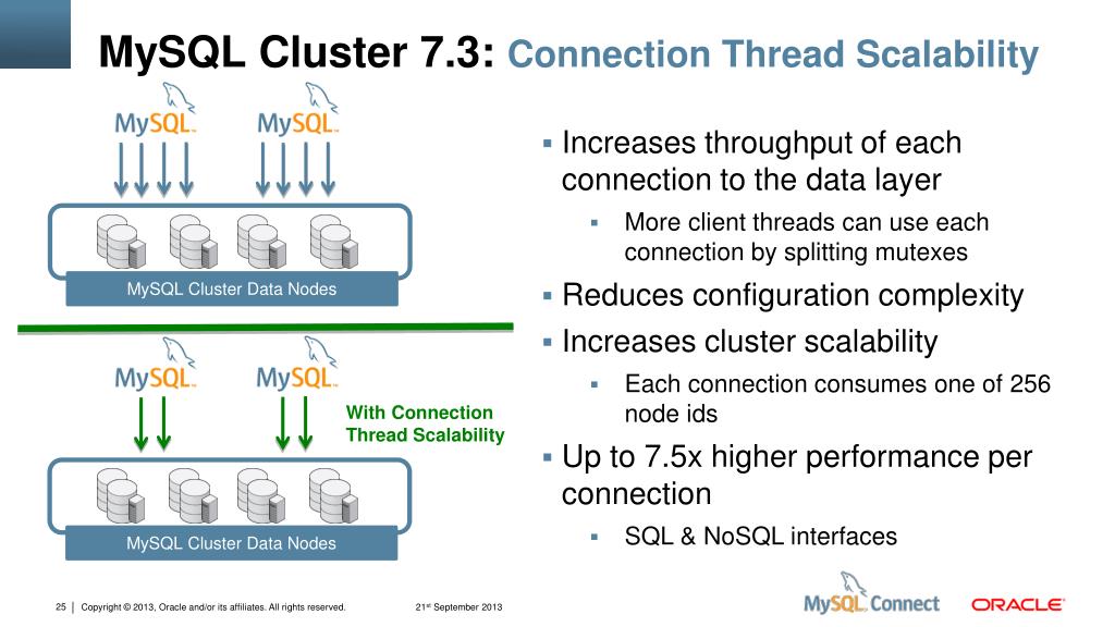 MySQL Cluster 7.3: Connection Thread Scalability • Increases throughput of each connection to the data layer • More client threads can use each connection by splitting mutexes • Reduces configuration complexity • Increases cluster scalability • Each connection consumes one of 256 node ids • Up to 7.5x higher performance per connection • SQL & NoSQL interfaces With Connection Thread Scalability MySQL Cluster Data Nodes MySQL Cluster Data Nodes