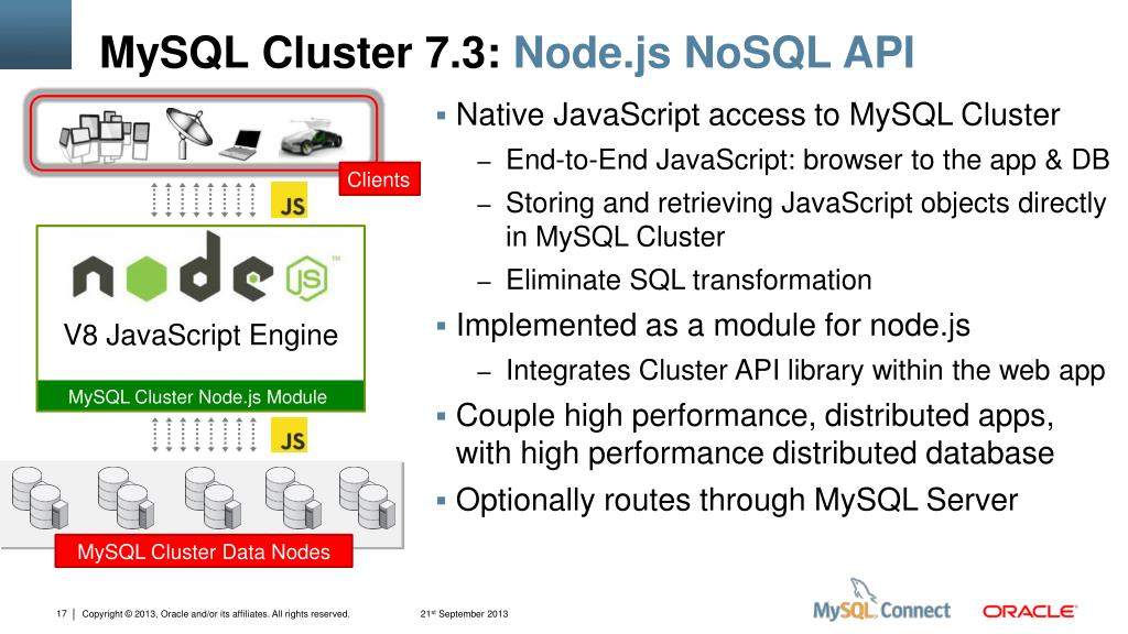 MySQL Cluster 7.3: Node.js NoSQL API • Native JavaScript access to MySQL Cluster • End-to-End JavaScript: browser to the app & DB • Storing and retrieving JavaScript objects directly in MySQL Cluster • Eliminate SQL transformation • Implemented as a module for node.js • Integrates Cluster API library within the web app • Couple high performance, distributed apps, with high performance distributed database • Optionally routes through MySQL Server