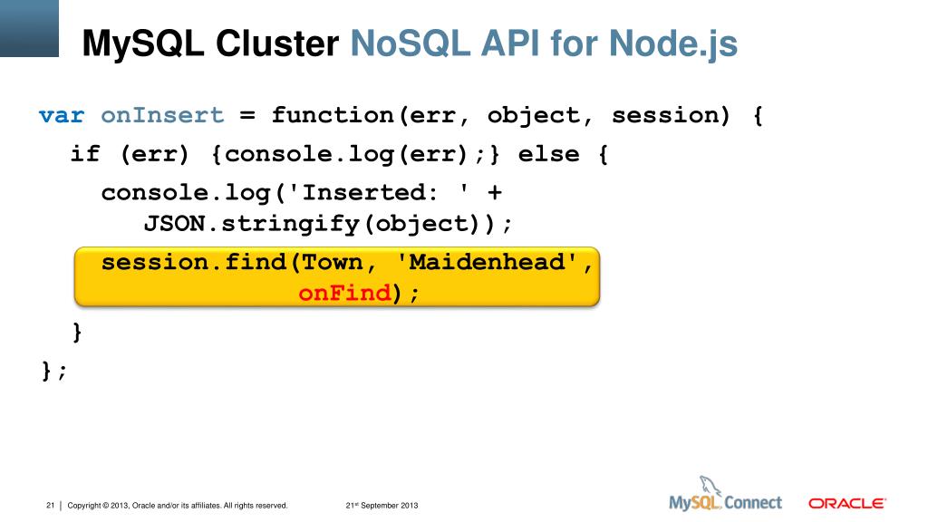 MySQL Cluster NoSQL API for Node.js varonInsert= function(err, object, session) { if (err) {console.log(err);} else { console.log('Inserted: ' + JSON.stringify(object)); session.find(Town, 'Maidenhead', onFind); } };