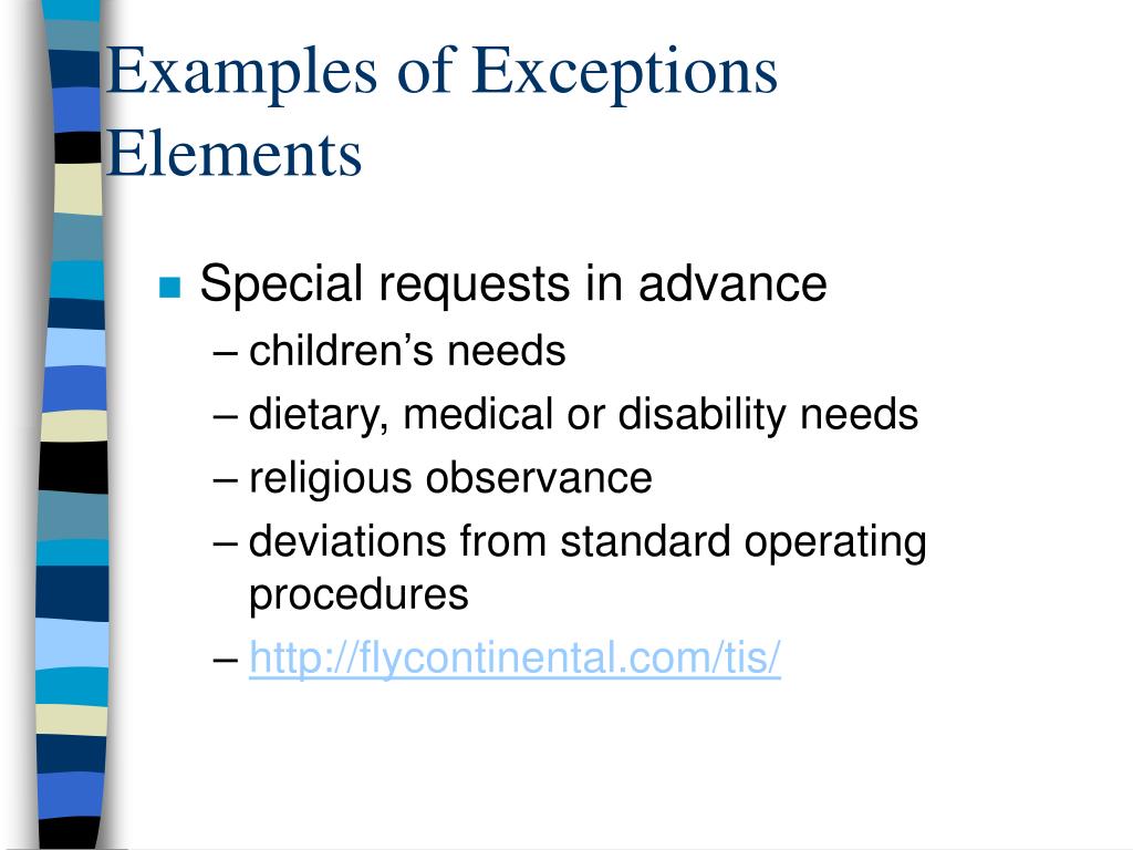 Examples of Exceptions Elements • Special requests in advance • children’s needs • dietary, medical or disability needs • religious observance • deviations from standard operating procedures • http://flycontinental.com/tis/