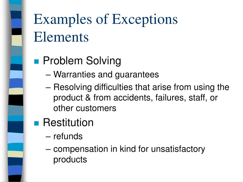 Examples of Exceptions Elements • Problem Solving • Warranties and guarantees • Resolving difficulties that arise from using the product & from accidents, failures, staff, or other customers • Restitution • refunds • compensation in kind for unsatisfactory products