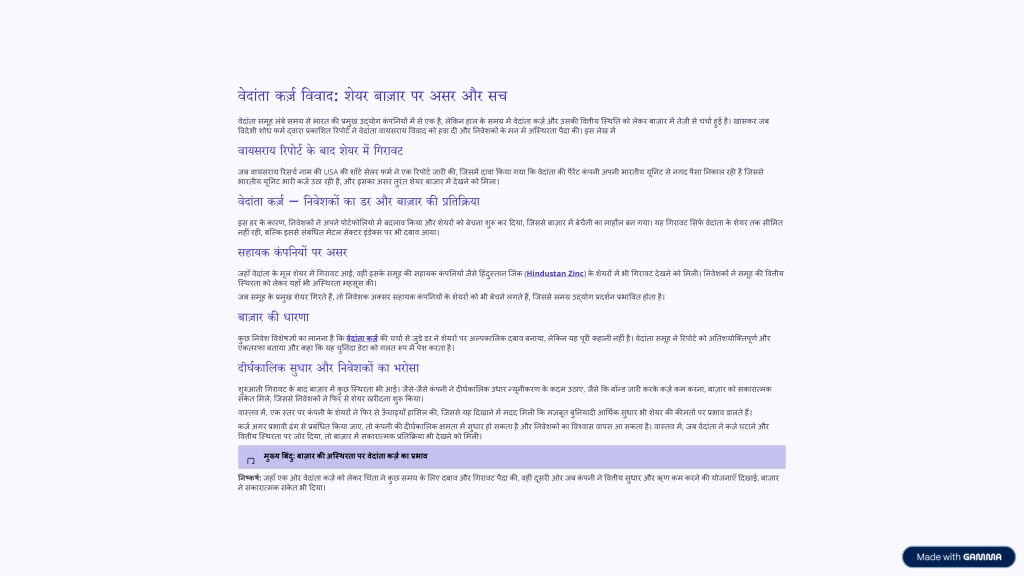 वेदांता कर्ज़ विवाद: शेयर बाज़ार पर असर और सच वेदांता समूह लंबे समय से भारत की प्रमुख उद्योग कंपनियों में से एक है, लेकिन हाल के समय में वेदांता कर्ज़ और उसकी वित्तीय स्थिति को लेकर बाज़ार में तेजी से चर्चा हुई है। खासकर जब विदेशी शोध फर्म द्वारा प्रकाशित रिपोर्ट ने वेदांता वायसराय विवाद को हवा दी और निवेशकों के मन में अस्थिरता पैदा की। इस लेख में वायसराय रिपोर्ट के बाद शेयर में गिरावट जब वायसराय रिसर्च नाम की USA की शॉर्ट सेलर फर्म ने एक रिपोर्ट जारी की, जिसमें दावा किया गया कि वेदांता की पैरेंट कंपनी अपनी भारतीय यूनिट से नगद पैसा निकाल रही है जिससे भारतीय यूनिट भारी कर्ज़ उठा रही है, और इसका असर तुरंत शेयर बाज़ार में देखने को मिला। वेदांता कर्ज़ – निवेशकों का डर और बाज़ार की प्रतिक्रिया इस डर के कारण, निवेशकों ने अपने पोर्टफोलियो में बदलाव किया और शेयरों को बेचना शुरू कर दिया, जिससे बाज़ार में बेचैनी का माहौल बन गया। यह गिरावट सिर्फ वेदांता के शेयर तक सीमित नहीं रही, बल्कि इससे संबंधित मेटल सेक्टर इंडेक्स पर भी दबाव आया। सहायक कंपनियों पर असर जहाँ वेदांता के मूल शेयर में गिरावट आई, वहीं इसके समूह की सहायक कंपनियों जैसे हिंदुस्तान जिंक (Hindustan Zinc) के शेयरों में भी गिरावट देखने को मिली। निवेशकों ने समूह की वित्तीय स्थिरता को लेकर यहाँ भी अस्थिरता महसूस की। जब समूह के प्रमुख शेयर गिरते हैं, तो निवेशक अक्सर सहायक कंपनियों के शेयरों को भी बेचने लगते हैं, जिससे समग्र उद्योग प्रदर्शन प्रभावित होता है। बाज़ार की धारणा कुछ निवेश विशेषज्ञों का मानना है कि वेदांता कर्ज़ की चर्चा से जुड़े डर ने शेयरों पर अल्पकालिक दबाव बनाया, लेकिन यह पूरी कहानी नहीं है। वेदांता समूह ने रिपोर्ट को अतिशयोक्तिपूर्ण और एकतरफा बताया और कहा कि यह चुनिंदा डेटा को गलत रूप में पेश करता है। दीर्घकालिक सुधार और निवेशकों का भरोसा शुरुआती गिरावट के बाद बाज़ार में कुछ स्थिरता भी आई। जैसे-जैसे कंपनी ने दीर्घकालिक उधार न्यूनीकरण के कदम उठाए, जैसे कि बॉन्ड जारी करके कर्ज़ कम करना, बाज़ार को सकारात्मक संकेत मिले, जिससे निवेशकों ने फिर से शेयर खरीदना शुरू किया। वास्तव में, एक स्तर पर कंपनी के शेयरों ने फिर से ऊँचाइयाँ हासिल की, जिससे यह दिखाने में मदद मिली कि मज़बूत बुनियादी आर्थिक सुधार भी शेयर की कीमतों पर प्रभाव डालते हैं। कर्ज़ अगर प्रभावी ढंग से प्रबंधित किया जाए, तो कंपनी की दीर्घकालिक क्षमता में सुधार हो सकता है और निवेशकों का विश्वास वापस आ सकता है। वास्तव में, जब वेदांता ने कर्ज़ घटाने और वित्तीय स्थिरता पर जोर दिया, तो बाज़ार में सकारात्मक प्रतिक्रिया भी देखने को मिली। मुख्य बिंदु: बाज़ार की अस्थिरता पर वेद