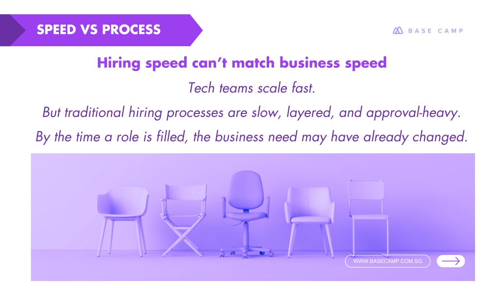 SPEED VS PROCESS Hiring speed can’t match business speed Tech teams scale fast. But traditional hiring processes are slow, layered, and approval-heavy. By the time a role is filled, the business need may have already changed. WWW.BASECAMP.COM.SG