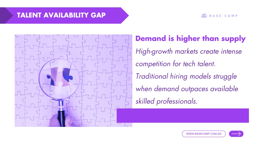 TALENT AVAILABILITY GAP Demand is higher than supply High-growth markets create intense competition for tech talent. Traditional hiring models struggle when demand outpaces available skilled professionals. WWW.BASECAMP.COM.SG
