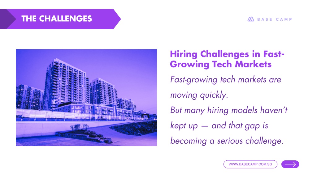 THE CHALLENGES Hiring Challenges in Fast- Growing Tech Markets Fast-growing tech markets are moving quickly. But many hiring models haven’t kept up — and that gap is becoming a serious challenge. WWW.BASECAMP.COM.SG